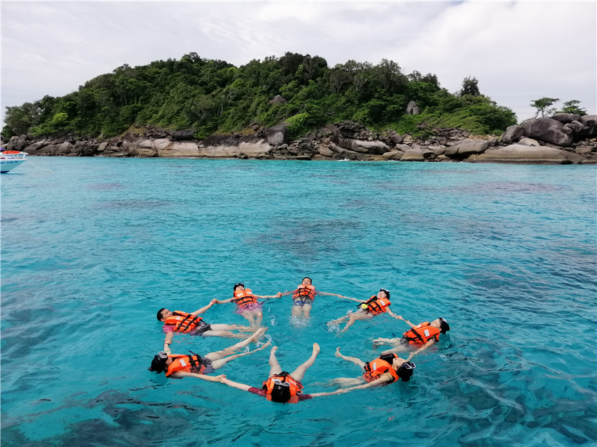 在普吉島,團隊體驗了當?shù)氐娘L土人情,還分別登上了有“珊瑚花園”之稱的潛水勝地斯米蘭島以及珊瑚島,在斯米蘭標志性的風動石下合影留念。大家在湛藍色的海水里浮潛觀魚,一起開心地“花樣游泳”,在這旖旎的海島風光里流連忘返,并從旅行當中收獲了新的感悟,讓一切變得更有意義。