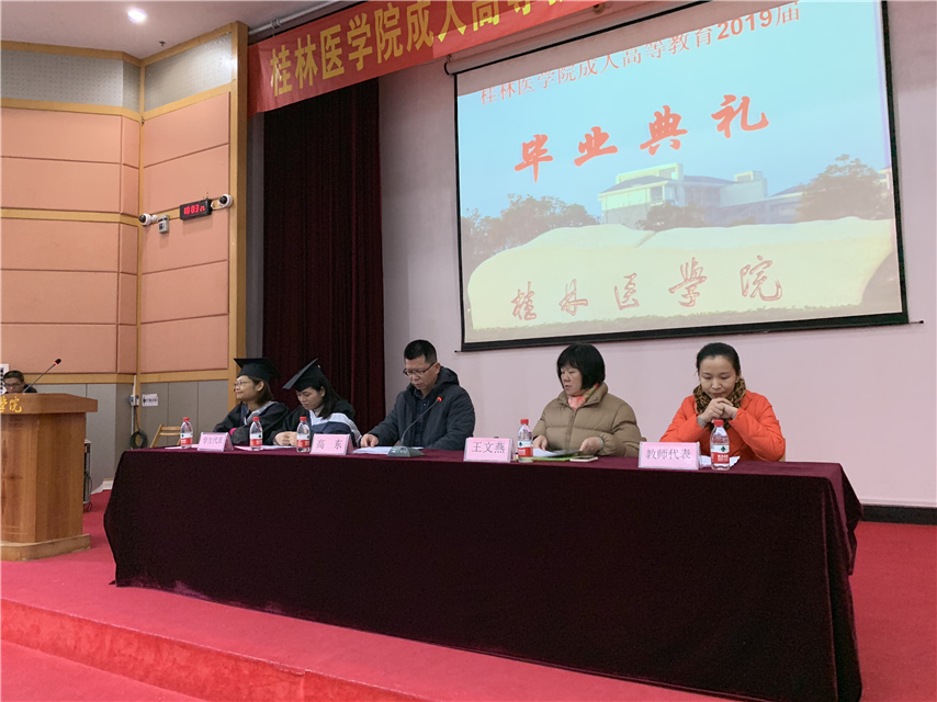 2019年1月9日上午,桂林醫(yī)學(xué)院校本部成人高等教育2019屆畢業(yè)生畢業(yè)典禮在東城校區(qū)多功能報告廳舉行。繼續(xù)教育學(xué)院院長高東、副院長王文燕及全體教師、班主任、畢業(yè)生代表260多名師生參加了畢業(yè)典禮,學(xué)生科科長張曉春主持典禮。