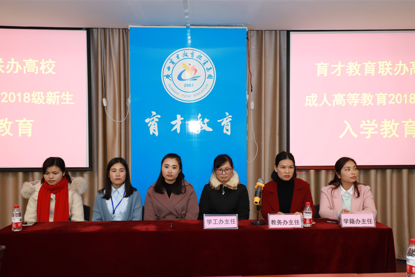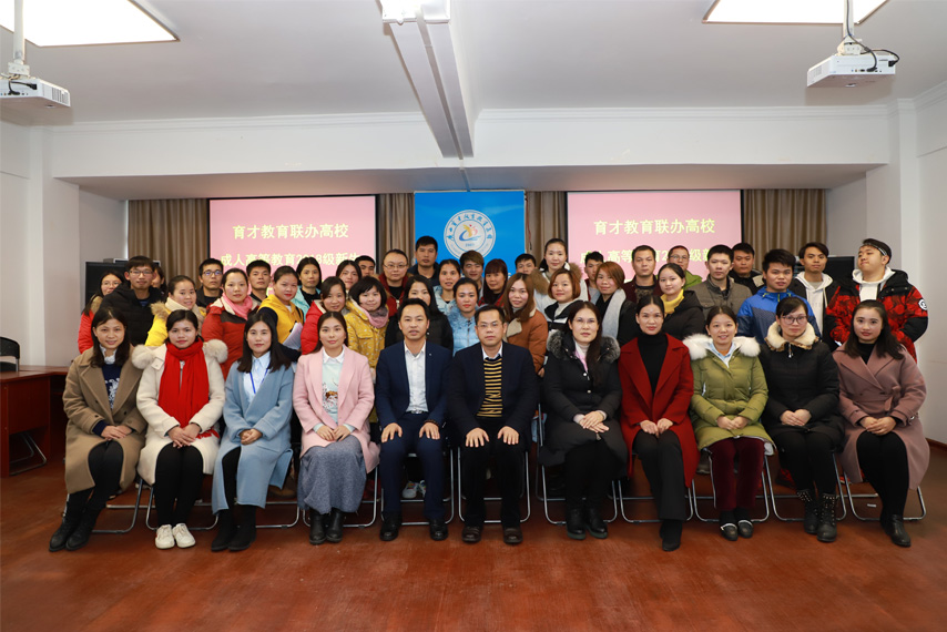 1月6日下午,育才聯(lián)辦的桂林電子科技大學(xué)、桂林理工大學(xué)、廣西民族大學(xué)、廣西教育學(xué)院2018級成高新生開學(xué)典禮在育才總部409多媒體教室召開,廣西育才教育黨支部書記、函授站站長蔣華老師、育才教育校長王志、常務(wù)副校長李彩梅和部分新生代表參加了典禮。