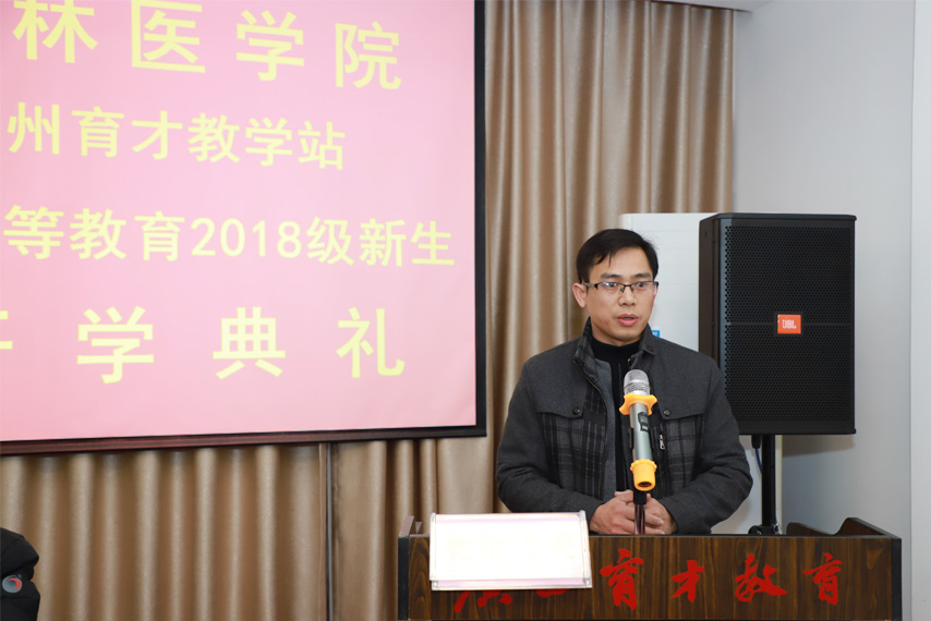桂林醫(yī)學(xué)院繼續(xù)教育學(xué)院院長高東代表學(xué)校向全體成教新生表示誠摯的問候和熱烈的祝賀,對(duì)長期以來支持桂林醫(yī)學(xué)院成教工作的育才教育表示衷心的感謝。他著重介紹了學(xué)校的發(fā)展歷史、師資隊(duì)伍建設(shè)等情況以及近年來在成人高等繼續(xù)教育方面所取得的成績,并希望2018級(jí)的新同學(xué)從今天起就要謹(jǐn)記自己是桂醫(yī)人,有機(jī)會(huì)一定要到桂林醫(yī)學(xué)院校本部去感受美麗的校園環(huán)境和良好的學(xué)習(xí)氛圍。同時(shí),要樹立信念,克服困難,把學(xué)歷提升和能力提升當(dāng)作是人生進(jìn)階的重要目標(biāo)和家庭文化傳承來看待,在三年里認(rèn)真完成學(xué)業(yè),并養(yǎng)成自學(xué)的能力和終身學(xué)習(xí)的習(xí)慣,讓自己飛得更高,走得更遠(yuǎn)。